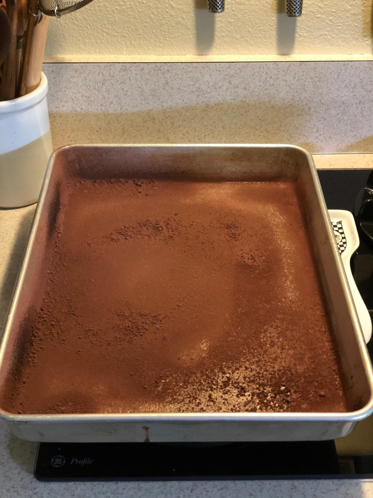 2. Grease a sheet pan then coat with flour (or cocoa!). Discard excess flour/cocoa that isn’t stuck to the pan. (Note: it’s best to use a sheet pan that has a lid so the cake stays fresh for days!