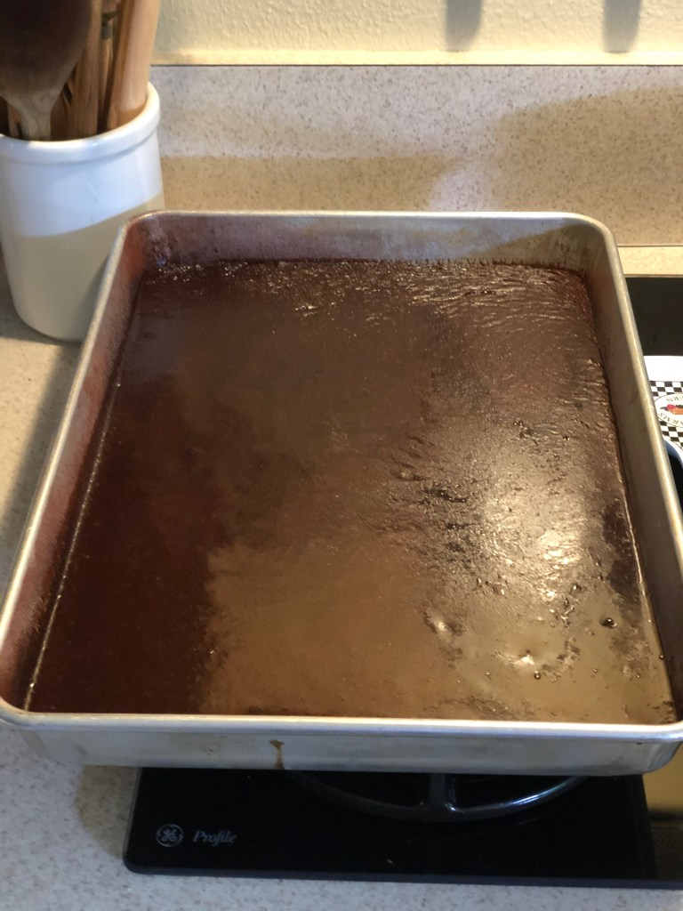 11. Pour the frosting over the cake, tipping the pan to get the frosting to cover the entire cake.