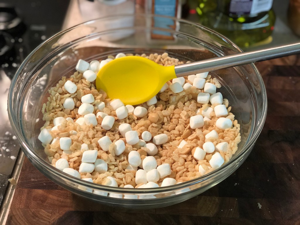 3. While the candy is melting, combine the peanuts, marshmallows and Rice Krispies in a large bowl.